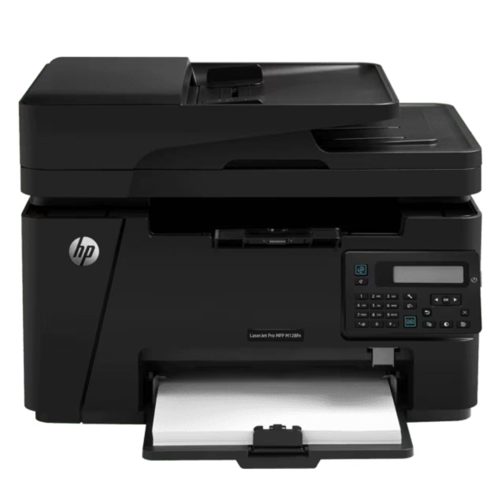The HP LaserJet Pro MFP M128fn is a compact multi-function monochrome laser printer that supports print, copy, scan and fax – ideal for small offices or home use.
